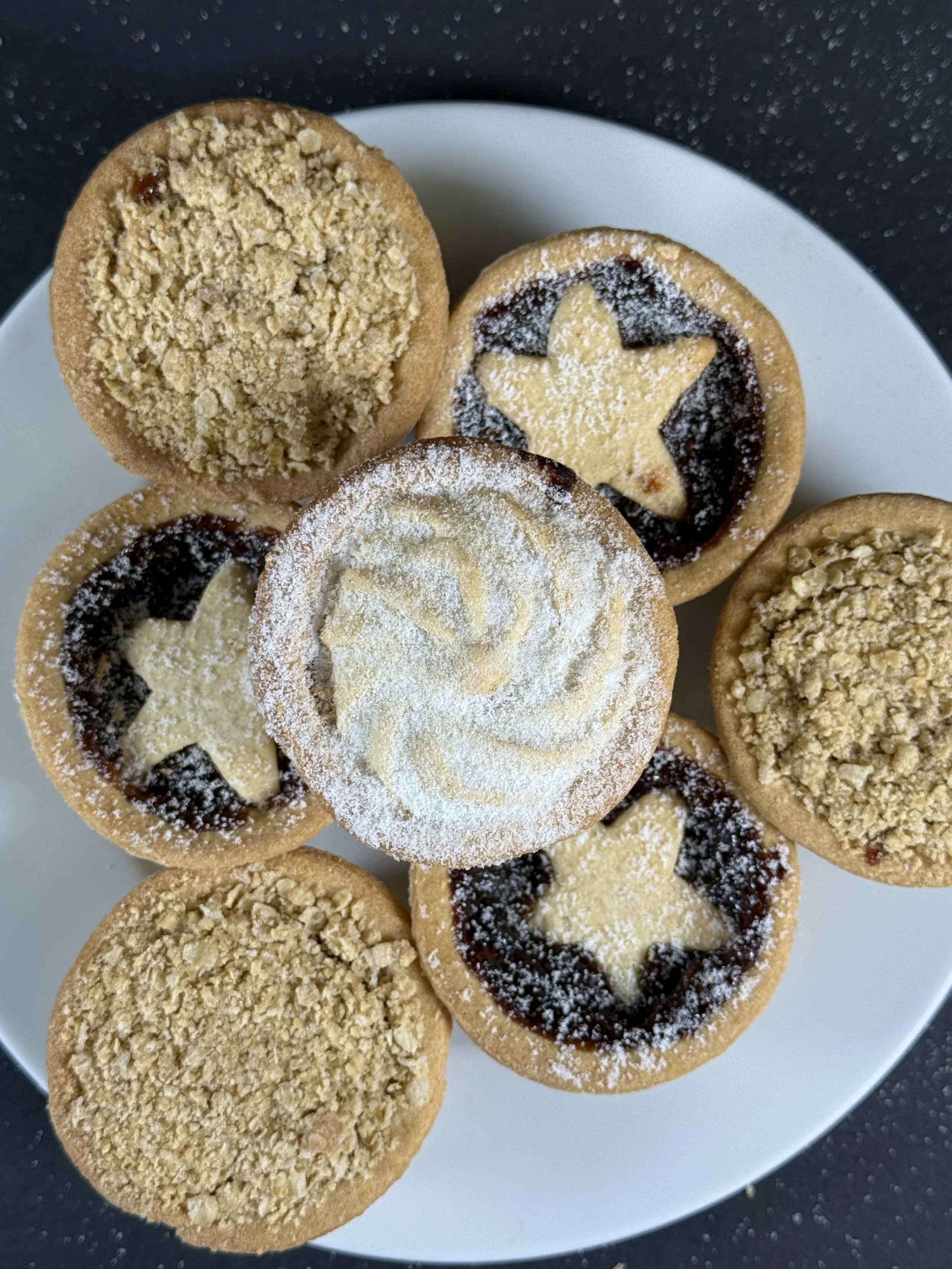 Includes: pastry, crumble & Viennese topped mince pies. Cheese and fruited scones, Gingerbread figures.
